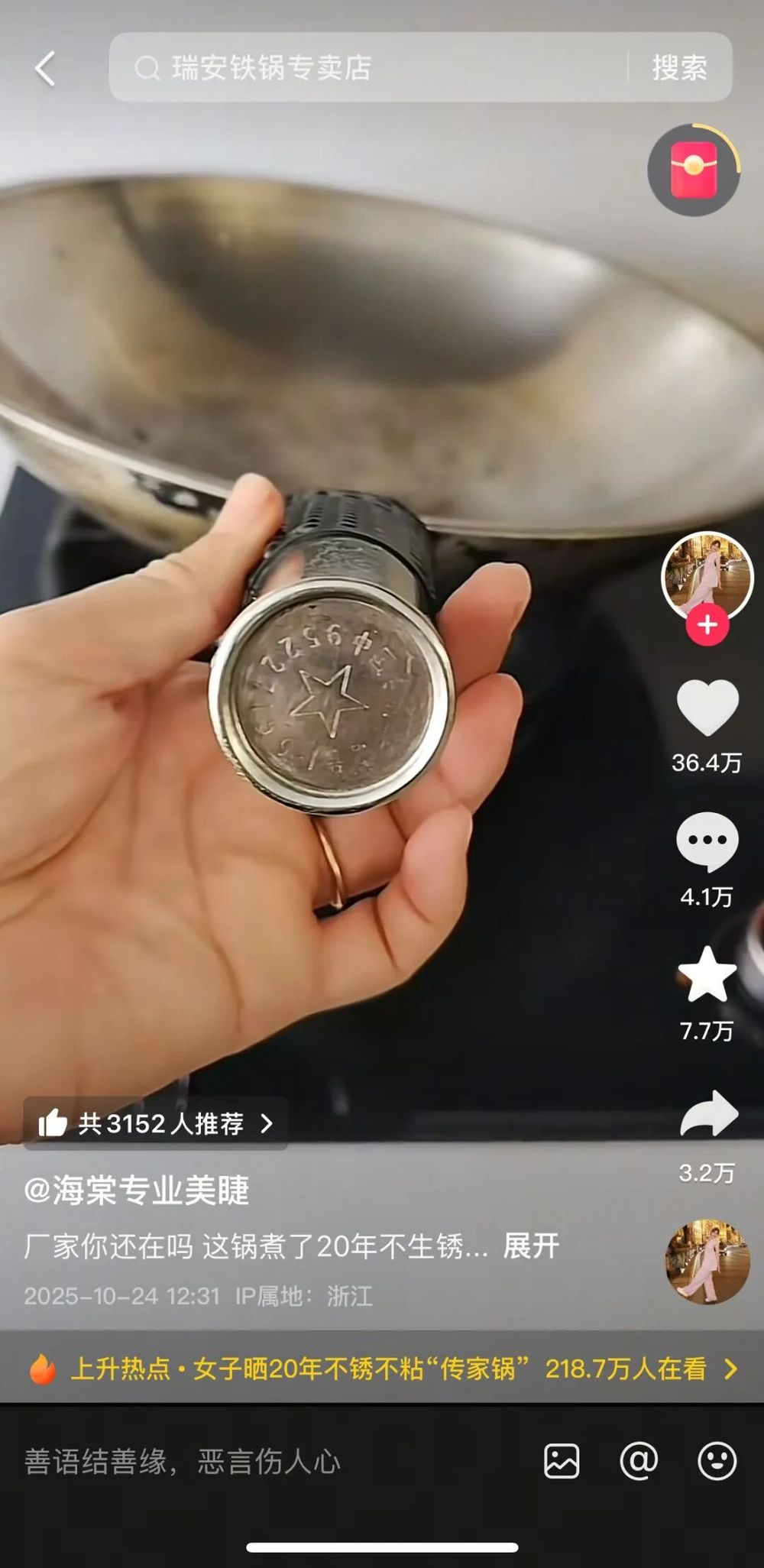 “厂家你还在吗?这锅煮了20年,不生锈、不粘锅,现在它好像要坏掉了,现在想再买一个,我要去哪里买?”10月24日,苍南桥墩的陈女士在自己的短视频途径账号上发布了一条“寻锅”视频,播放量近2000万,引发世人求购。短短几天时刻,开端寻觅锅厂家的视频点赞量已超40万。