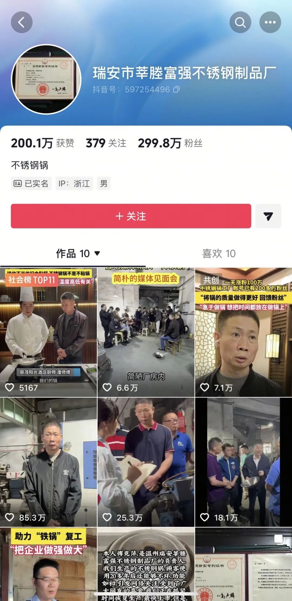 几天前,瑞安市莘塍富足不锈钢制品厂开通了官方账号,到11月6日17时,官方交际账号行将打破300万粉丝。该厂负责人傅克萍曾对媒体表明,复工后出产的锅具以“网红锅”为模板制造,但在用材、工艺上会更进一步。“比方不锈钢用材会提高,厚度也从之前的0.8毫米换成1.1毫米,凭据也从氩弧焊接改成激光焊接。”傅克萍说,为了不孤负网友的厚爱,新锅的质量必定不会比曾经的差,第一批产品估计11月就可出厂。